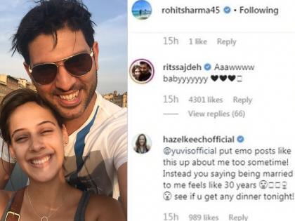 रोहितनं शेअर केलेल्या फोटोत तो तिच्या पत्नीचा हातात हात पकडून कुठेतही जात असल्याचे दिसत आहे. त्यावर रोहितनं लिहिलं की,''मी याधीही आनंदी होतो, पण तुझा हातात हात घेतल्यानंतर त्यापेक्षा अधिक आनंदी झालो आहे.'' रोहितच्या या पोस्टवर रितिकानंही लिहिले की,''Aaawwww babyyyyyyy.'' या दोघांचं हे प्रेम पाहून हेझलनं युवीला ट्रोल केलं. तिनं लिहिलं की,''युवी माझ्यासाठी पण असंच काहीतरी पोस्ट शेअर करत जा. माझ्याशी लग्न करून तुला तीस वर्ष झाली, असं वाटतं. बघूया आज रात्री तुला जेवण मिळतं की नाही ते.''