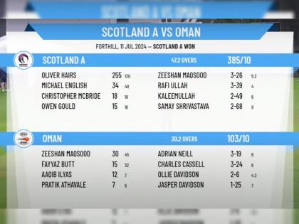 स्कॉटलंड अ संघाने ४७.२ षटकांत ३८५ धावा केल्या. हे आव्हान ओमानच्या संघाला पेलवले नाही. त्यांचा संपूर्ण संघ १०३ धावांतच गारद झाला. त्यांच्याकडून झीशान मकसूदने सर्वाधिक ३० धावा केल्या.