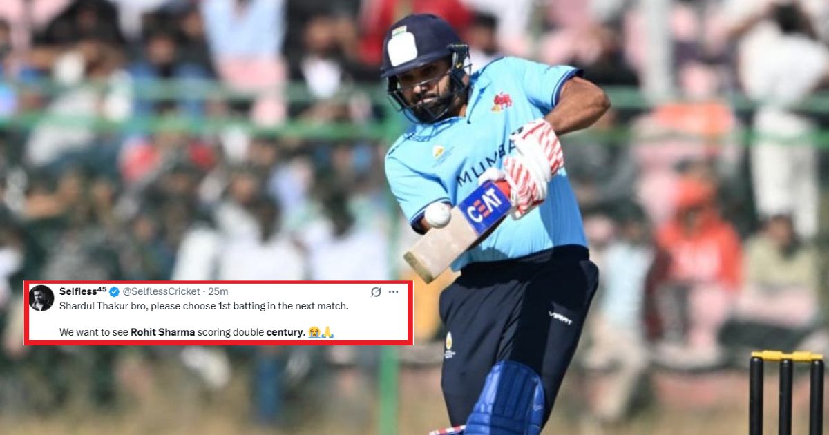 रोहित शर्माची दमदार फलंदाजी पाहिल्यावर चाहत्यांनी विजय हजारे ट्रॉफी स्पर्धेत मुंबई संघाचे नेतृत्व करणाऱ्या शार्दुल ठाकुरकडे खास डिमांड केल्याचेही पाहायला मिळाले. शार्दुल प्लीज पुढच्या सामन्यात पहिल्यांदा फलंदाजी करण्याचा निर्णय घे. आम्हाला रोहित शर्माचं द्विशतक पाहायचं आहे, अशी विनंती एका चाहत्याने एक्स अकाउंटरील ट्विटच्या माध्यमातून केली आहे. हीच भावना रोहितच्या अनेक चाहत्यांची आहे. त्यामुळेच हे ट्विट व्हायरलही होताना दिसत आहे.