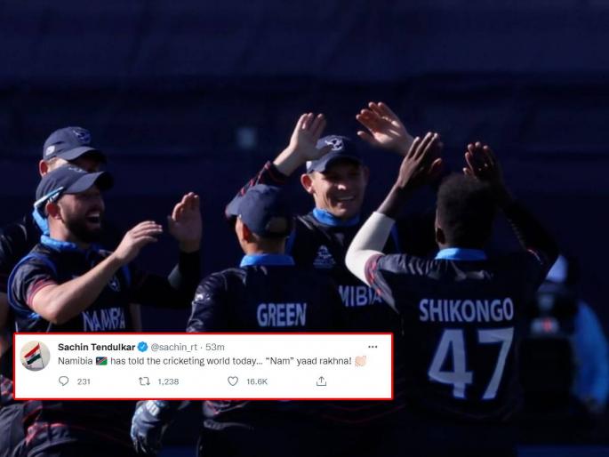 दरम्यान, सचिन तेंडुलकरने ट्विट करून नामिबियाच्या संघाचे विशेष कौतुक केले आहे. "नामिबियाच्या संघाने आज क्रिकेटच्या विश्वाला सांगितलं आहे की, 'नाम याद रखना", अशा शब्दांत मास्टर ब्लास्टर तेंडुलकरने नामिबियाच्या संघाचे कौतुक केले. प्रथम फलंदाजी करताना नामिबियाच्या संघाने २० षटकांत ७ बाद १६३ धावा केल्या, ज्याचा पाठलाग करताना श्रीलंकेचा संघ सर्वबाद केवळ १०८ धावा करू शकला.