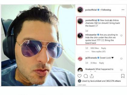 युवीनं एक फोटो पोस्ट केला होता आणि त्यावर लिहिले की,''चिकना चमेला! या लूकचे असेच वर्णन करायला हवे. पण, मी पुन्हा दाढी वाढवू का?'' युवीचा हा नवा लूक चाहत्यांना खूप आवडला, परंतु सानियानं त्यावरून युवीची फिरकी घेतली. ती म्हणाली,'' पाऊट देऊन गाल लपवण्याचा हा प्रयत्न आहे का? पुन्हा दाढी वाढवं.''