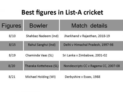 मुंबई : झारखंडच्या डावखुरा फिरकीपटू शाहबाज नदीमने लिस्ट 'A' क्रिकेटमधील 20 वर्षांपूर्वीचा विक्रम आपल्या नावे केला. विजय हजारे क्रिकेट स्पर्धेत 'C' गटातील राजस्थानविरुद्धच्या सामन्यात नदीमने 10 षटकांत 10 धावा देत 8 विकेट घेतल्या. यामध्ये त्याने 4 षटकं निर्धाव टाकली. या कामगिरीसह त्याने 1997-98 मध्ये दिल्लीच्या राहुल संघवीने नोंदवलेला विक्रम मोडला. संघवीने भारताकडून एक कसोटी व 10 वन डे सामनेही खेळले आहेत. दिल्लीच्या या डावखुऱ्या फिरकीपटूने 1997-98 मध्ये स्थानिक क्रिकेटमध्ये हिमाचल प्रदेशविरुद्ध 15 धावांत 8 विकेट घेतल्या होत्या.
