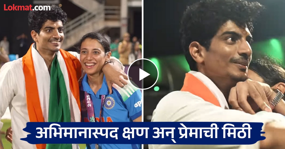 आयसीसीच्या इन्स्टाग्राम अकाउंटवरुन स्मृती मानधनाचा एक खास व्हिडिओ शेअर करण्यात आला आहे. या व्हिडिओमध्ये बॉलिवूडमधील लोकप्रिय चेहरा पलाश मुच्छल ट्रॉफी उंचावून नटलेल्या स्मृतीचं खास अंदाजात अभिनंदन करताना दिसून येते. स्मृती आणि पलाश यांच्यातील प्रेमाची मिठी दोघांच्यातील खास बॉन्डिंगची झलक दाखवणारी होती. एवढेच नाही तर पलाशनं तिरंगा स्मृतीकडे देत तिच्या अभिमानास्पद कामगिरीबद्दल दाखवलेल्या सन्मानाची भावनाही लक्षवेधी ठरतीये.