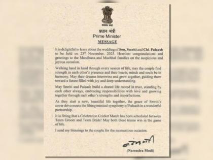 भारताचे पंतप्रधान नरेंद्र मोदी यांनी सौ. स्मृती आणि चि. पलाश यांच्या २३ नोव्हेंबर २०२५ रोजी होणाऱ्या लग्नानिमित्त मंधाना आणि मुच्छाल कुटुंबाचे हार्दिक अभिनंदन केले आणि त्यांना शुभेच्छा दिल्या. पंतप्रधानांनी नवदाम्पत्याला आयुष्याच्या प्रत्येक टप्प्यावर एकमेकांसोबत राहताना बळ मिळो, त्यांची स्वप्ने एकत्र गुंफली जावीत आणि त्यांचे जीवन आनंदी व समजूतदारपणाने भरलेले असावे, असे आशीर्वाद दिले. स्मृती आणि पलाश यांचा संसार विश्वास, प्रेम, जबाबदारी आणि एकमेकांवरील प्रेमाने भरलेला असावा. तसेच त्यांनी एकमेकांच्यात असलेल्या उणीवा स्वीकारून आपल्या वैवाहिक जीवनाची वाटचाल करावी, अशी सदिच्छा मोदी यांनी व्यक्त केली.