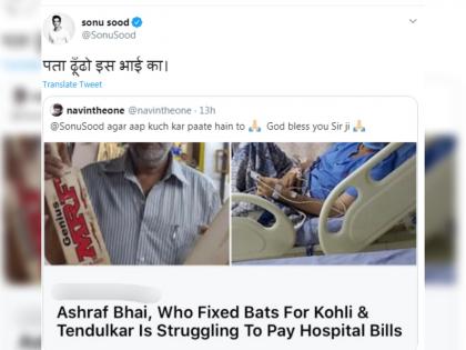 भारतीय संघाचा कर्णधार विराट कोहली आणि महान क्रिकेटपटू सचिन तेंडुलकर यांची क्रिकेट बॅट दुरुस्त करणारे अशरफ चौधरी सध्या अडचणीत आहेत. ज्या बॅटींनी कोहली व तेंडुलकरनं अनेक विक्रम केले, त्या बॅटची अशरफ चौधरी दुरुस्ती करायचे. असा हा कारागिर सध्या एक-एक पैशांसाठी संघर्, करत आहे. सोशल मीडियावर त्यांच्या प्रकृतीबाबत अनेक बातम्या प्रसिद्ध झाल्या, परंतु एकही क्रिकेटपटू त्यांच्या मदतीला पुढे आला नाही. अशात सोनू सूदला ही बातमी समजताच त्यानं मदतीसाठी हात पुढे केला आहे.