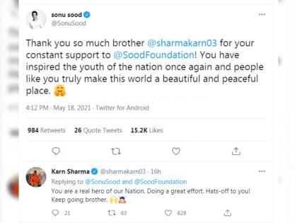 सोनूनं सांगितलं की CSKचा कर्ण शर्मा ( Karn Sharma) हा कोरोनाच्या लढाईत सातत्यानं मदत करत आहे. तो म्हणाला,''सोनू सूद फाऊंडेशनला तुमच्या निरंतर पाठिंब्यासाठी खूप-खूप आभार. तुम्ही पुन्हा एकदा देशातील युवकांना प्रेरणा दिली आहे आणि तुमच्यासारखी लोकं जगात स्वतःचं अढळ स्थान निर्माण करतात.'' कर्ण शर्मानेही त्याच्या या ट्विटला उत्तर दिले. त्यानं लिहिलं की,''तुम्ही आपल्या देशाचे खरे नायक आहात. तुम्हाला सलाम, असंच काम सुरू ठेवा.''