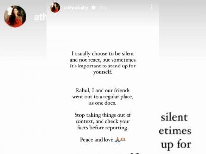 अथिया शेट्टीची इंस्टा स्टोरी... ''मी शक्यतो शांत राहणे आणि प्रतिक्रिया न देणे पसंत करते, परंतु काहीवेळा स्वतःसाठी उभं राहणं गरजेचं असतं. राहुल, मी आणि आमचे मित्र आम्ही नेहमीच्या ठिकाणी गेलो होतो. त्यामुळे वायफळ चर्चा करणं थांबवा, त्या करण्याआधी फॅक्ट चेक करा,''असे अथियाने लिहिले.