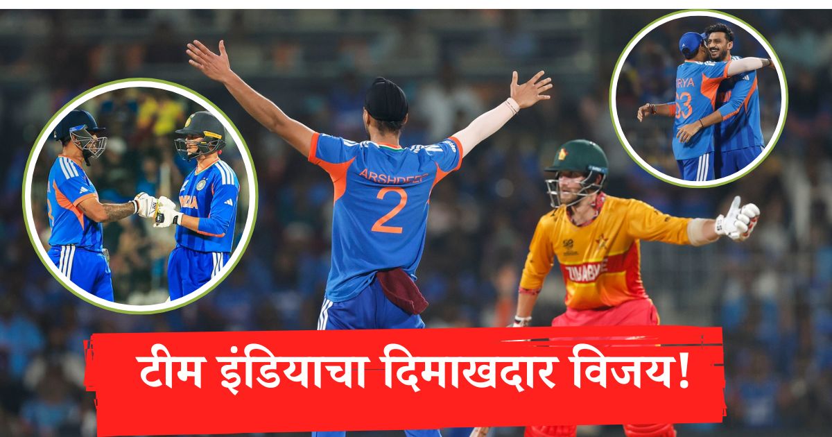 झिम्बाब्वेविरुद्धच्या सामन्यात प्रत्येक बॅटरनं आपली भूमिका चोख बजावताना संघाच्या धावफलकावर विक्रमी धावसंख्या लावली. त्यानंतर गोलंदाजीत अर्शदीप सिंगचा जलवा पाहायला मिळाला. अर्शदीपनं ४ षटकात २४ धावा खर्च करत संघाकडून सर्वाधिक ३ विकेट्स आपल्या खात्यात जमा केल्या. त्याच्याशिवाय वरुण चक्रवर्ती, अक्षर पटेल आणि शिवम दुबेनं प्रत्येकी १-१ विकेट घेतली. जसप्रीत बुमराहसह हार्दिक पांड्या विकेटलेस राहिला.