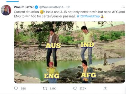 वासिम जाफरचं मीममध्ये हेच चित्र अगदी मार्मिकपणे मांडलंय. यात, ऑस्ट्रेलियाचं ओझं इंग्लंडच्या खांद्यावर आहे, तर टीम इंडियाची सगळी भिस्त अफगाणिस्तावर आहे. आता, कोण हे ओझं पेलतं आणि कुणाची विकेट पडते, हे लवकरच समजेल.