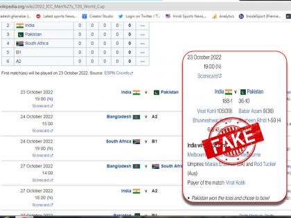 पण तत्पूर्वी काल सोशल मीडियावर एक स्कोअरकार्ड व्हायरल झालं. २३ ऑक्टोबर २०२२ ला होणाऱ्या India vs Pakistan यांच्यातल्या सामन्याचे ते स्कोअरकार्ड होतं आणि त्यात भारताचा विजय पक्का असे दिसत होतं. यात विराटच्या ३९ चेंडूंत १०५ धावांच्या जोरावर भारताने १ बाद १८८ धावा केल्या आणि पाकिस्तानचा संपूर्ण संघ ३६ धावांत गुंडाळून १५२ धावांनी विजय मिळवला. भुवनेश्वर कुमारने ९ धावांत ६ विकेट्स घेतल्याचे दिसतेय. मागच्या वर्ल्ड कप स्पर्धेत भारताच्या १५२ धावांच्या लक्ष्याचा पाकिस्तानने १० विकेट्स राखून पराभव केला होता. त्यामुळेच विकीपिडीयावर हा खोडसाळ पणा करण्यात आला आहे.