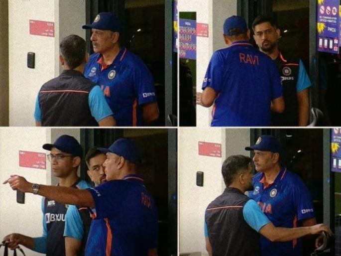T20 World Cup: Shastri & Dhoni in animated conversation: भारतीय संघाचे ट्वेंटी-२० वर्ल्ड कप स्पर्धेतील आव्हान संपुष्टात आले आहे. रविवारी न्यूझीलंडविरुद्धच्या पराभवानं टीम इंडियाचा पुढील मार्ग खडतर केला आहे. रवी शास्त्री- मुख्य प्रशिक्षक, विराट कोहली - कर्णधार आणि महेंद्रसिंग धोनी - मार्गदर्शक असं सगळं असूनही टीम इंडियाच्या लाजीरवाण्या कामगिरीवर सडकून टीका केली जात आहे. आता टीकेसाठीही शब्द कमी पडलेत, अशी प्रतिक्रिया माजी कर्णधार कपिल देव यांनी दिली. भारत-न्यूझीलंड ( India vs New Zealand) यांच्यातल्या सामन्यादरम्यान MS Dhoni आणि Ravi Shastri यांच्यातील संभाषण Live Matchमध्ये कॅमेरामननं टिपलं. व्हायरल झालेल्या फोटोवरून धोनी व शास्त्री यांच्यात वादाचे फटाके फुटल्याची चर्चा सुरू झाली आहे.