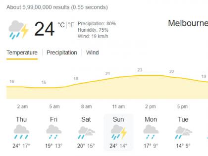 ''ढग दाटून आले आहेत आणि १०० टक्के पावसाची शक्यता आहे. वादळी वाराही सुटला असल्याने मुसळधार पाऊस अपेक्षित आहे. ताशी १५ ते २५ किमी वेगाने हवा सुटली आहे आणि सायंकाळी हा वेग अधिक वाढण्याचा अंदाज आहे,''असे ऑस्ट्रेलियाच्या हवामान खात्याकडून सांगण्यात आले आहे. फायनलसाठी सोमवारचा दिवस राखीव म्हणून ठेवला गेला आहे, परंतु सोमवारीही ९५ टक्के पावसाची शक्यता आहे.