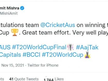 दुबई - काल झालेल्या आयसीसी टी-२० विश्वचषकाच्या अंतिम फेरीत ऑस्ट्रेलियाने न्यूझीलंडचा आठ गडी राखून पराभव केला. त्याबरोबरच ऑस्ट्रेलियाने पहिल्यांदाच टी-२० विश्वचषकावर नाव कोरले. या विजयानंतर ऑस्ट्रेलियन संघावर शुभेच्छांचा वर्षाव सुरू झाला आहे. भारताचा फिरकीपटू अमित मिश्रा यानेही शुभेच्छा दिल्या. मात्र त्याने ऑस्ट्रेलियन संघाऐवजी न्यूझीलंडला विश्वविजेतेपद पटकावल्याबद्दल शुभेच्छा दिल्या. त्यामुळे अमित मिश्रा ट्विटर आणि सोशल मीडियावर मोठ्या प्रमाणात ट्रोल झाला.