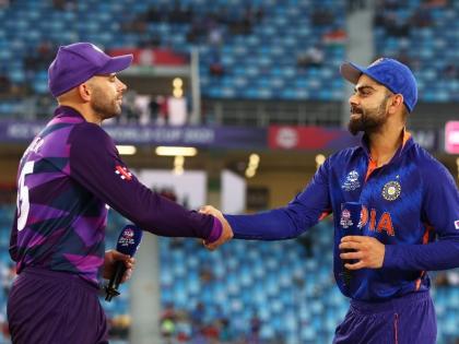 कर्णधार विराट कोहलीनं ( Virat Kohli) वाढदिवसाला नाणेफेक जिंकली आणि स्कॉटलंडला प्रथम फलंदाजीचे आमंत्रण दिले. भारतीय संघानं उपांत्य फेरीचं गणित लक्षात ठेऊनच हा निर्णय घेतला. आजच्या संघात टीम इंडिया तीन फिरकीपटूंसह मैदानावर उतरली आहे. शार्दूल ठाकूरच्या जागी वरुण चक्रवर्थीचे संघात पुनरागमन झाले आहे. भारतीय गोलंदाज जसप्रीत बुमराह तिसऱ्याच षटकात स्कॉटलंडचा सलामीवीर कायले कोएत्झरचा त्रिफळा उडवला.