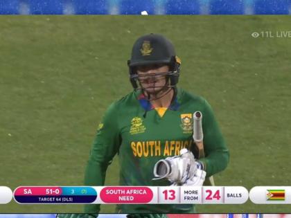 T20 World Cup, SOUTH AFRICA V ZIMBABWE : पाऊस आणि दक्षिण आफ्रिका यांच्यात छत्तीसचा आकडा असल्याचे पुन्हा एकदा दिसले. आफ्रिकेला ट्वेंटी-२० वर्ल्ड कप स्पर्धेतील ग्रुप २ मधील पहिल्याच सामन्यात झिम्बाब्वेविरुद्ध ९-९ षटकांचा खेळ खेळावा लागला. झिम्बाबेने ८० धावांचे लक्ष्य समोर असताना क्विंटनने १२ चेंडूंत फलकावर ४० धाव चढवल्या. आफ्रिकेने ३ षटकांत ५१ धावा चढवल्या अन् पुन्हा पाऊस सुरू झाला. त्यानंतर अम्पायर्सनी सामन रद्द करण्याचा निर्णय घेतला.