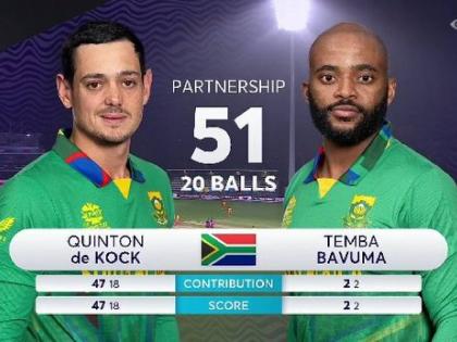 प्रत्युत्तरात क्विंटन डी कॉकने पहिल्याच षटकात ४,४,४,६,४,१ अशा २३ धावा चोपून काढताना झिम्बाब्वेच्या चाहत्यांना गप्प केले. आंतरराष्ट्रीय ट्वेंटी-२० क्रिकेटमध्ये पहिल्याच षटकातील या सर्वाधिक धावा ठरल्या आहेत. पहिल्या षटकानंतर पुन्हा पाऊस सुरू झाला अन् ५ मिनिटांत गेलाही. पण, आफ्रिकेसमोर ७ षटकांत ६४ झावांचे लक्ष्य ठेवले गेले आणि त्यांना ५.५ षटकांत ४० धावा करायच्या होत्या. नेमका किती षटकांचा सामना हे ठरवण्यात बराच वेळ वाया गेला अन् पुन्हा पाऊस सुरू झाला. क्विंटनने फटकेबाजी सुरूच ठेवली आणि ४ चौकार खेचून दोन षटकांत ४० धावा चढवल्या. या दोन षटकांत क्विंटनच्या ३९ धावा झाल्या आणि ट्वेंटी-२० पहिल्या दोन षटकांत सर्वाधिक ३३ धावांचा डेव्हिड वॉर्नरचा ( वि. वेस्ट इंडिज, २०१०) विक्रम मोडला गेला.