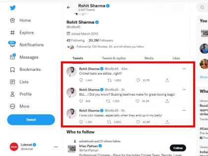 रोहित शर्मा याच्या ट्विटर अकाऊंटवरून मंगळवारच्या (१ मार्च) दिवसात सकाळपासून ३ ट्वीट्स करण्यात आली आहेत. पण विशेष बाब म्हणजे, ही सर्व ट्वीट्स फारच विचित्र आणि असंबंध असल्याचं दिसून येत आहे. रोहितच्या या ३ ट्वीट्सच्या तपशीलाचा एकमेकांशीही फारसा संबंध नसल्याचं दिसून येत आहे. त्यामुळे रोहितचं नक्की काय चाललंय... असा प्रश्न चाहत्यांना पडलेला असून त्याचं अकाऊंट हॅक झाल्याचा दाट संशय चाहत्यांना आहे.