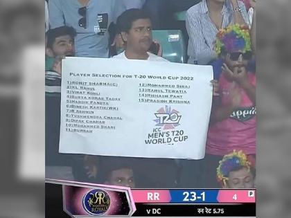 दिल्ली आणि राजस्थान यांच्यात बुधवारी IPLचा सामना रंगला. या सामन्यात ऋषभ पंतच्या नेतृत्वाखालील दिल्ली संघाने ८ गडी राखून विजय मिळवला. या सामन्यात एक चाहता थेट मोठ्या पोस्टरवर विश्वचषकातील भारतीय संघ निवडून त्यांची नावे दाखवताना दिसला. तसेच, जेव्हा त्याच्या पोस्टरचा फोटो सोशल मीडियावर व्हायरल झाला तेव्हा लोकांनीही ट्विटरवर त्याच्या सिलेक्शनवर कमेंट्स केल्या.