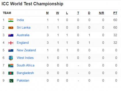 जागतिक कसोटी अजिंक्यपद स्पर्धेंतर्गत येणाऱ्या प्रत्येक मालिकेसाठी आयसीसीनं गुणांची विभागणी केली आहे. त्यानुसार भारतीय संघाने वेस्ट इंडिजला नमवून 60 गुणांची कमाई केली आहे. या विजयामुळे भारतीय संघाने जागतिक कसोटी अजिंक्यपद स्पर्धेच्या गुणतालिकेत अव्वल स्थानी झेप घेतली आहे. टीम इंडिया आणि श्रीलंका यांच्या खात्यातील गुणांची संख्या समसमान आहे. पण, भारताने मोठ्या फरकाने विजय मिळवून अव्वल स्थान पटकावले. या क्रमवारीत ऑस्ट्रेलिया व इंग्लंड प्रत्येकी 32 गुणांसह अनुक्रमे तिसऱ्या व चौथ्या स्थानी आहेत.