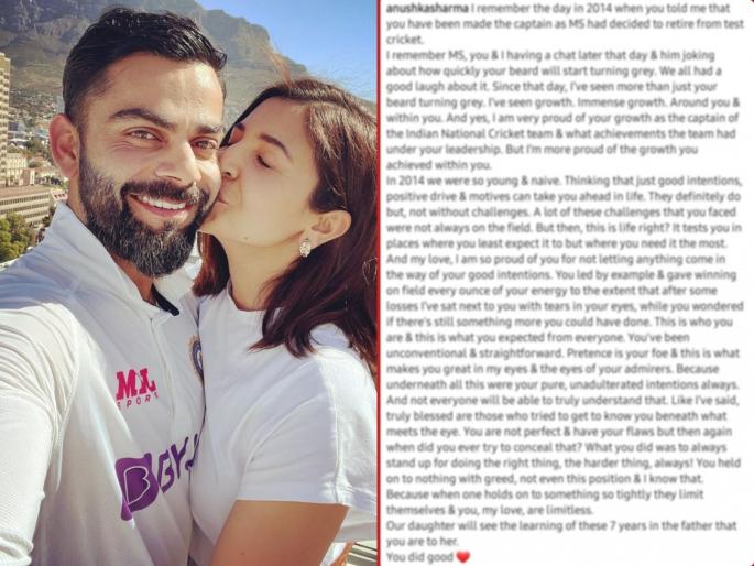 विराटच्या या प्रवासाची साक्षीदार असलेली त्याच पत्नी व बॉलिवूड अभिनेत्री अनुष्का शर्मा ( Anushka Sharma) हिनं इंस्टाग्राममवर भावनिक पत्र लिहिलं आहे. त्यात तिनं विराटच्या या प्रवासाची माहिती दिली आहे. ती म्हणते,'' २०१४ची गोष्ट आजही मला आठवतेय. महेंद्रसिंग धोनीनं कसोटी क्रिकेटमधून निवृत्ती जाहीर केली आणि तू मला सांगितलेस की मी कसोटी संघाचा कर्णधार बनणार आहे. दुसऱ्याच दिवशी तू, MS आणि मी गप्पा मारत होतो आणि तेव्हा तुझ्या दाढीचे केस आतापासूनच राखाडी होत असल्याचे गमतीनं MS म्हणाला. आपण सर्व तेव्हा भरपूर हसलो होतो. त्यादिवसापासून तुझ्या दाढीचे केस राखाडी होताना मी पाहतेय. मी तुझ्यातली वाढ पाहिली आहे, अफाट वाढ. तुझ्या आजूबाजूला आणि तुझ्या आत. आणि हो भारताच्या राष्ट्रीय संघाचा कर्णधार म्हणून तुझ्या वाढीचा आणि तुझ्या नेतृत्वाखाली संघानं मिळवलेल्या यशाचा मला  सार्थ अभिमान आहे. परंतु, त्याहीपेक्षा तुझ्यात अंतरंगात झालेल्या वाढीचा मला अधिक अभिमान आहे.''