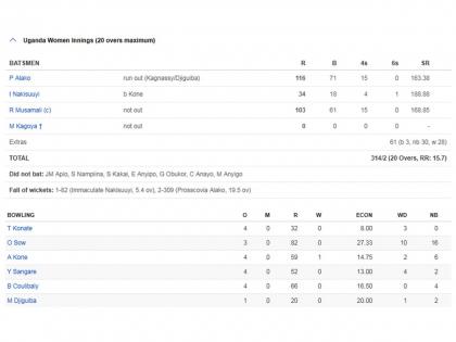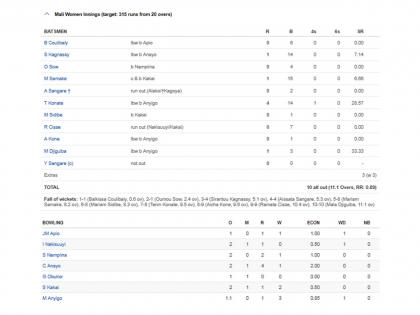 मालीच्या गोलंदाजांनी 60 अतिरिक्त धावा दिल्या, त्यात 30 नो बॉल आणि 28 व्हाईड चेंडूंचा समावेश होता. मालीच्या ओमोऊ सोऊने 3 षटकांत 82 धावा दिल्या आणि ट्वेंटी-20 क्रिकेटमधील ही सर्वात लाजीरवाणी कामगिरी आहे. प्रत्युत्तरात मालीचा संपूर्ण संघ 11.1 षटकांत 10 धावांवर तंबूत परतला. मालीचे सहा फलंदाज भोपळाही फोडू शकले नाही. त्यांच्याकडून टी कोनाटेने सर्वाधिक चार धावा केल्या.