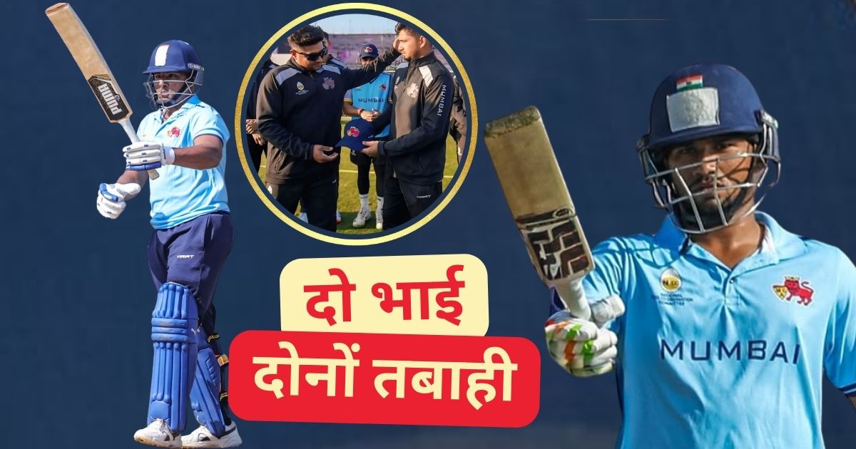 Musheer Khan Received His Debut Cap In VHT From Brother Sarfaraz Khan : विजय हजारे ट्रॉफी स्पर्धेतील उत्तराखंड विरुद्धच्या सामन्यात मुंबईच्या संघाने मुशीर खान या युवा अष्टपैलू खेळाडूला पदार्पणाची संधी दिली. खास गोष्ट ही की, त्याचा थोरला मोठा भाऊ आणि टीम इंडियाकडून खेळलेल्या सरफराज खान यानेच आपल्या धाकट्या भावाला मुंबई लिस्ट ए क्रिकेटमधील पदार्पणाची कॅप दिली. मुंबईच्या ताफ्यातील हा क्षण दोन्ही भावांसह खान कुटुंबियासह खास आणि अविस्मरणीय असा होता. एवढेच नाही तर या सामन्यात दोन्ही भावांनी अर्धशतकी खेळी करताना समान धावा काढल्या. त्यामुळे मुंबई विरुद्ध उत्तराखंड यांच्यातील सामन्यात एक कमालीचा योग पाहायला मिळाला.