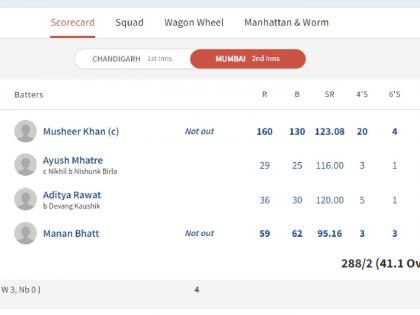VINOO MANKAD TROPHY - विनू मांकड ट्रॉफी स्पर्धेतील आजच्या सामन्यात मुंबईच्या मुशीर खानने ( Musheer Khan) अष्टपैलू कामगिरी करून चंडिगढ संघाला गुडघे टेकण्यास भाग पाडले. मुशीरने १० षटकांत ५७ धावा देताना २ विकेट्स घेतल्या आणि त्यात ३६ चेंडू निर्धाव फेकले. त्यानंतर लक्ष्याचा पाठलाग करताना कॅप्टन्स इनिंग्स खेळून १३० चेंडूंत २० चौकार व ४ षटकारांच्या मदतीने नाबाद १६० धावा चोपल्या. मुंबईने ८ विकेट्स राखून हा सामना जिंकला.
