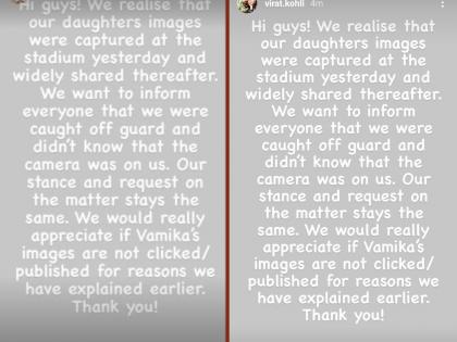 ''आमच्या मुलीचा फोटो काल टीपला गेला अन् तो प्रचंड व्हायरल झाला. आम्हाला तुम्हाला हे सांगायचे आहे की कॅमेरामन आमचे छायाचित्र टिपतोय हे माहित नव्हतं. या प्रकरणी आमचं आजही तेच मत आहे. त्यामुळे वामिकाचे फोटो काढले किंवा छापले जाणार नाहीत, याची कृपया करून काळजी घ्या. यामागचं कारण मी आधीच सांगितलं आहे'',अशा प्रकारची स्टोरी विराट-अनुष्कानं पोस्ट केली आहे.