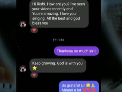 विराट कोहलीने ऋषीला मेसेज लिहताना म्हटले, Hi ऋषी, कसा आहेस? मी काही वेळापूर्वीच तुझ्या व्हिडीओ पाहिल्या तू कमाल आहेस. मला तुझी सर्व गाणी आवडतात. ऑल द बेस्ट गॉड ब्लेस यू. याला उत्तर देताना ऋषीने विराट कोहलीचे आभार मानले. यानंतर विराटने आणखी एका मेसेजमध्ये लिहिले की, "खूप प्रगती कर, देव तुच्यासोबत आहे."