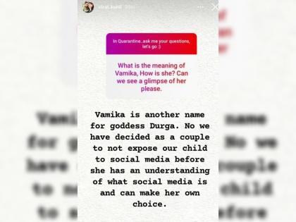 विराटनं वामिकाचा अर्थ सांगितला. तो म्हणाला,''देवी दुर्गाचं दुसरं नाव वामिका असं आहे. जोपर्यंत वामिकाला सोशल मीडिया म्हणजे काय हे कळत नाही आणि ती स्वतः त्याचा वापर सुरू करत नाही, तोपर्यंत तिचा फोटो पोस्ट न करण्याचा निर्णय मी आणि अनुष्कानं घेतला आहे.'' जानेवारी २०२१मध्ये विराट-अनुष्काच्या घरी नन्ही परी आली. त्यावेळी विराट व अनुष्कानं त्यांच्या वैयक्तिक आयुष्यात कृपया दखल देऊ नका, असे आवाहन केलं होतं. या दोघांनी एकत्रितरित्या एक पोस्ट लिहिली होती.