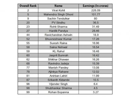 कोहलीपाठोपाठ सर्वाधिक कमाई करणाऱ्या खेळाडूंमध्ये माजी कर्णधार महेंद्रसिंग धोनी, महान फलंदाज सचिन तेंडुलकर यांचा क्रमांक येतो. विशेष बाब म्हणजे बॅडमिंटन स्टार पी. व्ही. सिंधू चौथ्या स्थानावर आहे आणि दहा अव्वल खेळाडूंमध्ये स्थान पटकावणारी ती दुसरी महिला खेळाडू आहे. फुलराणी सायना नेहवाल 10व्या स्थानावर आहे. मनिष पांडे, जसप्रीत बुमरा यांनी प्रथमच या यादीत स्थान पटकावले आहे. बुमराने 60वे, तर पांडेने 77 वे स्थान पटकावले आहे.