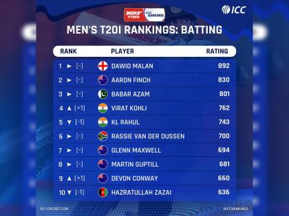 इंग्लंडच्या डेवीड मलान ( ८९२), ऑस्ट्रेलियाचा अॅरोन फिंच ( ८३०) आणि पाकिस्तानचा बाबर आझम ( ८०१) अव्वल तीन स्थानावर कायम आहेत. विराटच्या खात्यात ७६२, तर राहुलच्या खात्यात ७४३ गुण आहेत.