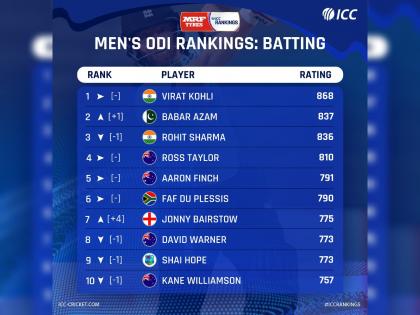 वन डे फलंदाजांमध्ये विराट कोहली ८६८ गुणांसह टॉपवर कायम आहे, परंतु रोहित शर्माची तिसऱ्या स्थानी घसरण झाली आहे. पाकिस्तानच्या बाबर आझमनं ( ८३७) त्याला मागे टाकले. रोहितच्या खात्यात ८३६ गुण आहेत.