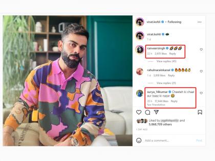 विराट कोहलीने मंगळवारी इन्स्टाग्रामवर स्वतःचा एक फोटो शेअर केला. फोटोमध्ये विराट कोहलीने रंगीत पोलो नेक टी-शर्ट घातला आहे. हा टी-शर्ट रंगीबेरंगी आहे. या फोटोला मोठ्या प्रमाणावर लाईक्स मिळत आहेत. पण या फोटोवर करण्यात आलेल्या दोन कमेंट्स चांगल्याच भाव खाऊन गेल्या. सूर्यकुमार यादवने विराट कोहलीच्या या फोटोवर, बाजीराव-मस्तानी चित्रपटातील 'चिते की चाल और बाज की नजर', अशी कमेंट केली आणि हसण्याचा स्माइली पोस्ट केला. तर रंगीबेरंगी कपड्यांच्या फॅशनसाठी प्रसिद्ध असलेल्या रणवीर सिंगनेदेखील इंद्रधनुष्याचे इमोजी टाकत त्या फोटोवर कमेंट केली.