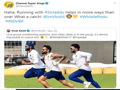 याच झेलचे श्रेय CSKनं जडेजाला दिलं. विराटनं काही दिवसांपूर्वी एक ट्विट केलं होतं, त्या त्यानं जडेजासोबतचा धावतानाचा फोटो शेअर केला होता. त्यावर त्यानं असं लिहीलं की, जडेजाला पकडणे अवघड आहे. CSKनं हाच फोटो पुन्हा रिशेअर केला आणि म्हटलं की,''जडेजासोबत धावण्याचे अनेक फायदे. सुपर कॅच...''
