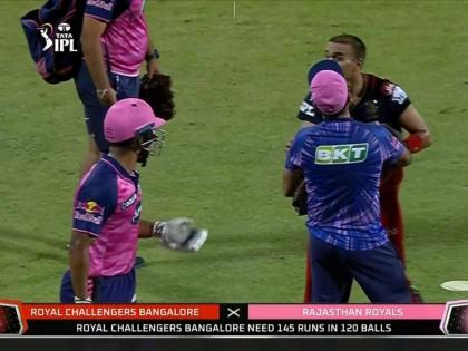 रियान परागने या सामन्यात एकाकी झूंज देताना २९ चेंडूंत अर्धशतक ठोकलं. परागने ३१ चेंडूंत ३ चौकार व ४ षटकारांसह नाबाद ५६ धावा केल्या. त्यानं हर्षल पटेलनं टाकलेल्या २०व्या षटकात १८ धावा चोपल्या. अखेरच्या चेंडूवर खणखणीत षटकार खेचून पेव्हेलियनच्या दिशेने जाणाऱ्या रियानकडे पाहून हर्षल काहीतरी बडबडला. त्यानंतर रियान जाब विचारण्यासाठी माघारी फिरला. दोघांमध्ये वाद वाढणार हे लक्षात येताच राजस्थानच्या सपोर्ट स्टाफमधील सदस्यानं हर्षलला रोखलं.