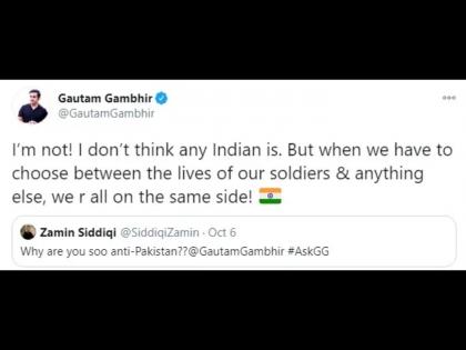 ट्विटरवर गंभीरनं Ask Me Anything मधून नेटिझन्सना काही विचारण्यास सांगितले. याच सेशनमध्ये त्याला एका नेटिझन्सने, तू इतका पाकिस्तानी विरोधी का? असा प्रश्न विचारला. त्यावर गंभीरनं भन्नाट उत्तर दिलं. तो म्हणाला,''मी नाही आणि भारतीयही असतील असं मला वाटत नाही. पण. जेव्हा आमच्या जवानांचे आयुष्य आणि अन्य काही यात निवड करण्याची वेळ येते. तेव्हा आम्ही सर्व भारतीय एकाच बाजूला उभे राहिलेलो दिसू.''