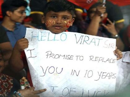 नवी दिल्ली - सध्या सोशल मीडियावर एक फोटो व्हायरल होत आहे. यामध्ये विराट कोहलीच्या एका फॅनने त्याला मजेदार आव्हान दिलं आहे. यामध्ये विराटला 10 वर्षात रिप्लेस करण्याच आव्हान त्या फॅनने दिलं. पंजाब आणि बंगळुरुच्या सामन्यादरम्यानाचा हा फोटो आहे. दहा वर्षाच्या लहान मुलाच्या हातात एक पोस्टर आहे. त्या पोस्टरवर 'हैलो विराट सर, अगले 10 साल में आपको रिप्लेस करने का वादा करता हूं, बेस्ट ऑफ लक.' असे लिहण्यात आले आहे. सोशल मीडियावर या फोटोवर प्रतिक्रिया येत आहेत. यामध्ये एका नेटीझन्सने या फोटोला एेतिहासिक म्हटले आहे. एक नेटिझन्सने असे म्हटले आहे की, जर हा मुलगा भारतीय संघात खेळला तर हा क्षण त्याच्यासाठी ऐतिहासिक राहिल.