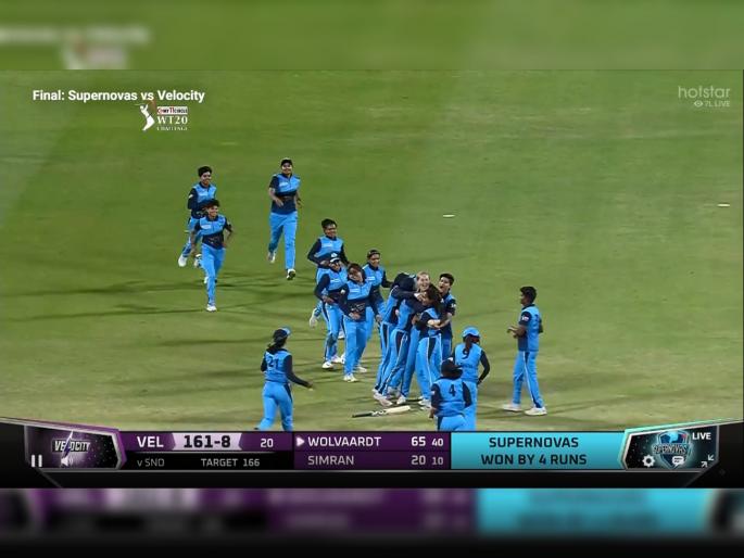Womens T20 Challenge Final SUPERNOVAS vs VELOCITY : सुपरनोव्हाज आणि व्हेलॉसिटी यांच्यातला महिला ट्वेंटी-२० लीग चॅलेंज स्पर्धेचा अंतिम सामना कमालीचा चुरशीचा झाला. १६६ धावांच्या लक्ष्याचा पाठलाग करताना व्हेलॉसिटीचा निम्मा संघ ६४ धावांत माघारी परतला होता. सुपरनोव्हाज संघाचा विजय निश्चित मानला जात होता. पण, व्हेलॉसिटिच्या लॉरा वोलव्हार्ड ( Laura Wolvaardt) आणि सिमरन बहादूर ( Simran Bahadur) यांनी अखेरच्या षटकापर्यंत सामना नेला. पण, त्यांना विजयापासून ४ धाव दूर रहावे लागले. डिएंड्रा डॉटिनच्या ( Deandra Dottin ) अष्टपैलू कामगिरीच्या जोरावर सुपरनोव्हाजने तिसरे जेतेपद नावावर केले. डॉटिनने ६२ धावा चोपल्या आणि नंतर दोन विकेट्सही घेतल्या. हरमनप्रीत कौर ( Harmanpreet Kaur) व अलाना किंग (Alana King) यांनीही आजच्या विजयात मोठा वाटा उचलला.
