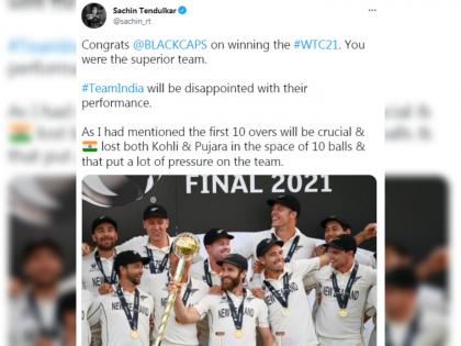 सचिन तेंडुलकरनं ट्विट केलं की, जागतिक कसोटी अजिंक्यपद जिंकणाऱ्या न्यूझीलंड संघाचे अभिनंदन... तुम्ही वर्चस्व गाजवले. भारतीय संघ त्यांच्या कामगिरीने निराश झाला असेल. मी आधीच सांगितले होते की सहाव्या दिवसाची पहिली १० षटकं अत्यंत महत्त्वाची आहेत आणि भारतानं दहा चेंडूंत विराट व पुजारा या दोन महत्त्वाच्या विकेट्स गमावल्या आणि त्यामुळे संघावर प्रचंड दडपण वाढलं...