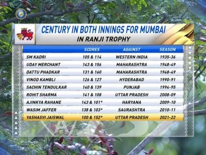 मुंबईने दिवसअखेर १ बाद १३३ धावा केल्या आहेत. यशस्वी ११४ चेंडूंत ५ चौकार व १ षटकारासह ३५ धावांवर, तर अरमान जाफर ६७ चेंडूंत ५ चौकारांसह ३२ धावांवर खेळत होता. यशस्वी व अरमान यांनी चौथ्या दिवशी दुसऱ्या विकेटसाठी विक्रमी २८६ धावांची भागीदारी केली. अरमान २५९ चेंडूंत १५ चौकार व २ षटकारांसह १२७ धावांवर बाद झाला. यशस्वीनेही शतक झळकावले. त्याने पहिल्या डावातही शतकी खेळी केली होती आणि मुंबईकडून रणजी करंडकात दोन्ही डावांत शतक झळकावणारा तो ९ वा फलंदाज ठरला आहे. यशस्वी १७५ धावांवर खेळतोय आणि मुंबईची आघाडी ६१३ धावांपर्यंत पोहोचली आहे.