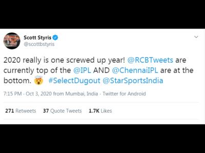 2020 really is one screwed up year! RCB are currently top of the IPL 2020 and CSK are at the bottom, Scott Styris tweet