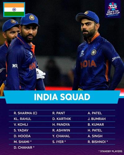 भारत- रोहित शर्मा ( कर्णधार), लोकेश राहुल, विराट कोहली, सूर्यकुमार यादव, दीपक हुडा, रिषभ पंत, दिनेश कार्तिक, हार्दिक पांड्या, आर अश्विन, युजवेंद्र चहल, अक्षर पटेल, जसप्रीत बुमराह, भुवनेश्वर कुमार, हर्षल पटेल, अर्शदीप सिंग; राखीव - मोहम्मद शमी, श्रेयस अय्यर, रवी बिश्नोई, दीपक चहर