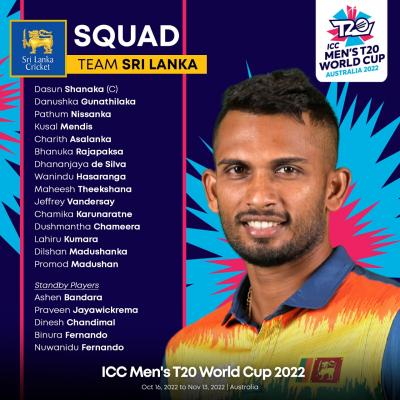 श्रीलंका - दासुन शनाका (कर्णधार), धनुष्का गुनाथिलका, पथुम निसंका, कुसल मेंडिस, चरित असलंका, बानुका राजपक्षे, धनंजया डी सिल्वा, वानिदू हसरंगा, महेश थिक्शाना, जेफ्री वांडरसे, चमिका करूणारत्ने, दुष्मंथा चमीरा, लहिरू कुमारा, दिलशान मधुशंका, प्रमोद मधुशान; राखीव खेळाडू - ॲशेन बंडारा, प्रवीण जयविक्रेमा, दिनेश चंडीमल, बिनुरा फर्नांडो, नुवानिंदू फर्नांडो,
