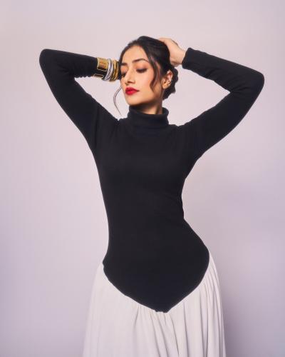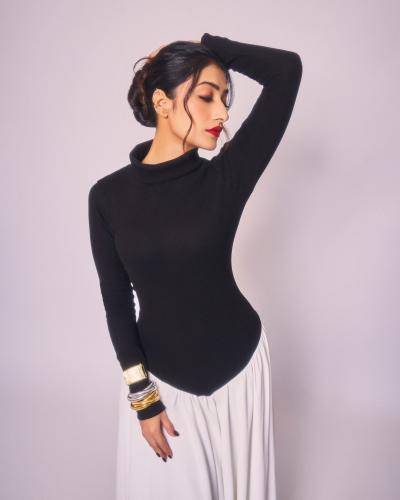 या फोटोशूटमध्ये धनश्रीने बंद गळ्याचा काळा स्वेटशर्ट घातला आहे. त्यावर गोल्डन रंगाच्या बांगड्या घालून काहीसा फ्यूजन लूक साकारला आहे.