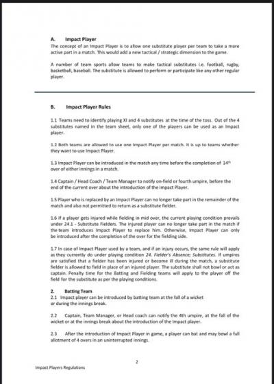 १० संघामुळे BCCI ने आयपीएल २०२३चा कालावधी दोन महिन्यांवरून अडीच महिने करण्याचा निर्णय घेतलाय आणि ICC नेही त्यासाठी आंतरराष्ट्रीय क्रिकेटमध्ये विंडो उपलब्ध करून दिली आहे. त्यात आता आयपीएलमध्ये नवी नियम आणण्याची तयारी बीसीसीआयने सुरू केली आहे. फुटबॉल, रग्बी, बास्केटबॉल, कबड्डी आदी खेळांमध्ये जसे राखीव खेळाडू मैदानावर खेळू शकतात तसाच हा नियम असणार आहे आणि ‘IMPACT PLAYER’ असे त्याला नाव दिले गेले आहे.