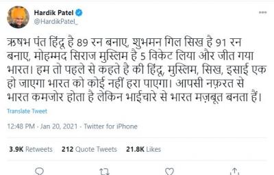 ‘रिषभ पंत हिंदू आहे त्याने ८९ धावा बनवल्या, शुभमन गिल शीख आहे त्याने ९१ रन बनवल्या, मोहम्मद सिराज मुस्लिम आहे त्याने ५ विकेट घेतल्या आणि भारत जिंकला. आपण पहिल्यापासूनच म्हणतो की, ‘हिंदू, मुस्लिम, शीख, इसाई एक झाले तर भारताला कोणीही हरवू शकत नाही. परस्पर द्वेषाने भारत कमकुवत आहे, परंतु बंधुता भारताला मजबूत बनवते.’असा संदेश देखील हार्दिक पटेल यांनी दिला आहे.