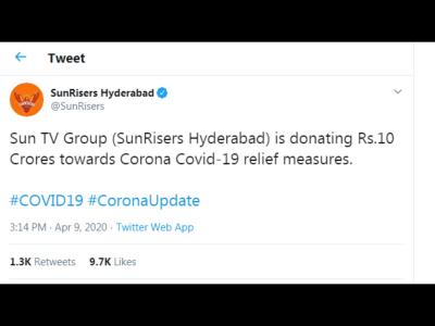 Corona Virus : Sunrisers Hyderabad (SRH) donate INR 10 crores towards Coronavirus relief measures svg