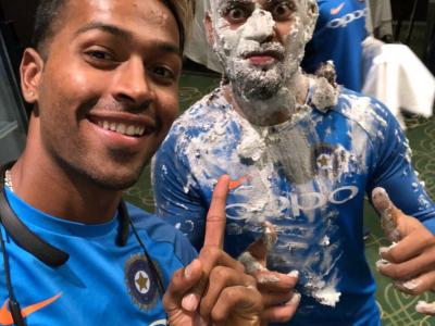विराटने केक कापून झाल्यानंतर हार्दिकने त्याचा बदला घेतला. त्याने विराटच्या चेह-याला केक लावून अक्षरशः त्याला भूत बनवलं. 17 ऑक्टोबरला पांड्याचा वाढदिवस होता. तेव्हा पांड्याच्या चेह-यावर पूर्णपणे केक लावण्यात आला होता. त्यावेळी, वर्षात प्रत्येकाचा वाढदिवस येतो...बदला घेतला जाईल असं पांड्या म्हणाला होता.