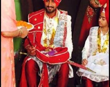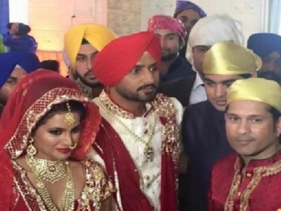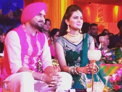 विवाहसोहळ्यातील एक विधी पार पाडताना हरभजनगुलाबी रंगाच्या शेरवानीत पंजाबचाजवान हरभजन तर हिरव्या रंगाच्या घागरा-चोलीत गीताचे सौंदर्य आणखी खुलून दिसत होते.गायक मिका सिंगने या संगीत सोहळ्याला चार चांद लावले.हपभजन-गीताचा संगीत आणि मेहंदी सोहळाही अतिशय शानदार झाला.लग्नाच्या बेडीत अडकण्यासाठी सज्ज झालेल्या हरभजनने ऑफ व्हाईट रंगाची शेरवानी घातली होती.लाल आणि सोनेरी रंगाची एम्ब्रॉयडरी असलेल्या वधूच्या जोड्यात गीता अतिशय सुंदर दिसत होती.भारताचा फिरकीपटू आणि अभिनेत्री गीता बसरा यांच्या अनेक वर्षांच्या प्रेमप्रकरणाची परिणती अखेर आज ( २९ ऑक्टोबर) विवाहात झाली. कुटुंबिय आणि मित्रांच्या साक्षीने ते दोघे जालंधरंध्ये लग्नबंधनात अडकले. या विवाहसोहळ्याला मास्टर ब्लास्टर सचिन तेंडुलकरनेही हजेरी लावली. ( फोटो सौजन्य: सोशल नेटवर्किंग साईट्स)